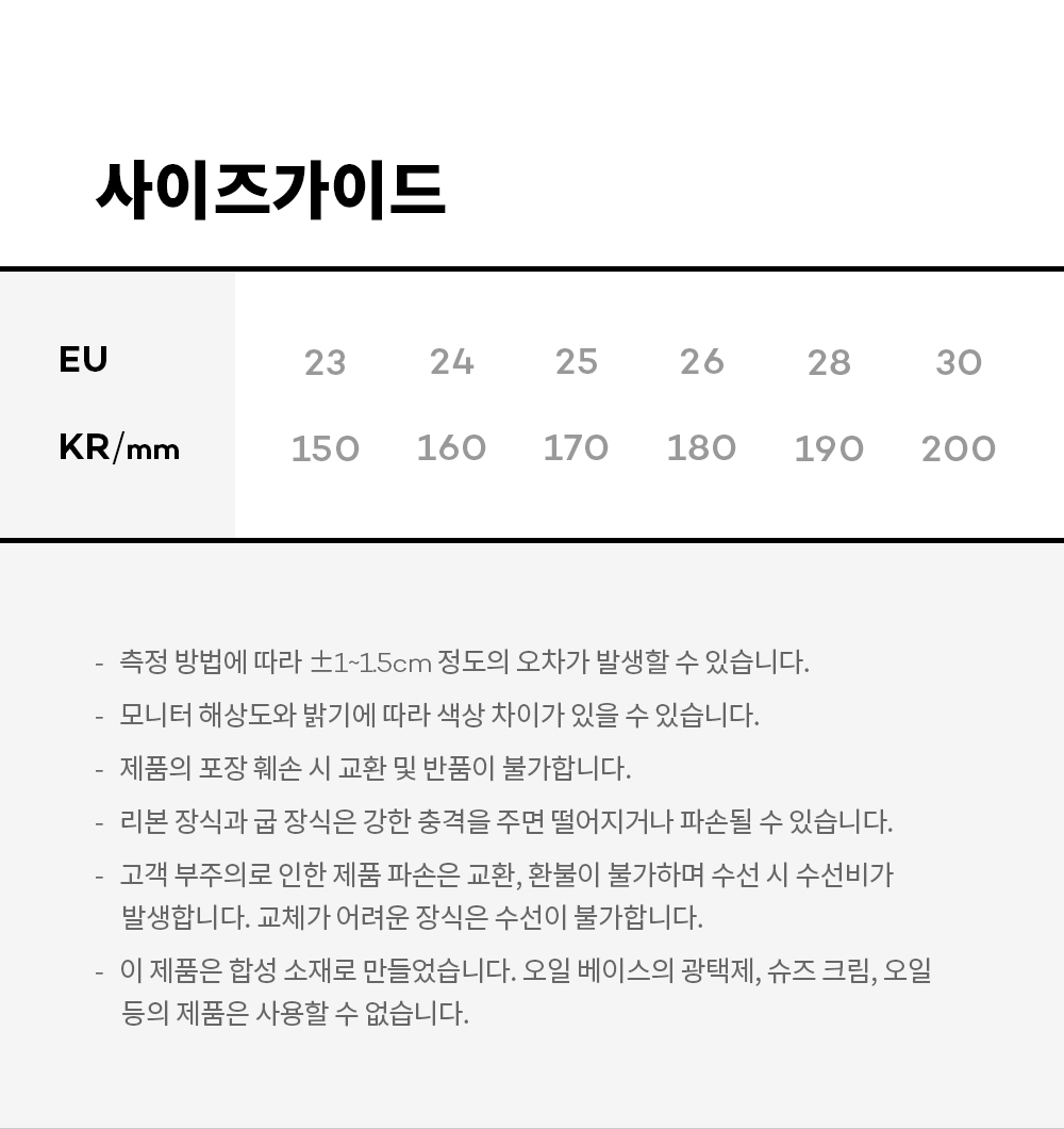 · 1. 신고 걸을 때 꼭 스트랩을 부착해주세요. 2. 미끄럼 방지 기능은 수명과 관계 되어 오랜시간 착화시 마모로 인해 그 기능이 저하 될수 있습니다. 3. 표백성분이 있는 세제.세탁기.탈수기는 사용하지마십시오. 4. 에스컬레이터 탑승시 안전사고 예방을 위하여 안전선 안에 위치 하십시오. 5. 리본 장식과 금속 장식은 강한 충격을 주면 떨어지거나 파손될 수 있습니다. 6. 장시간 착용, 격한 활동은 소재 특성상 마모될 수 있습니다.