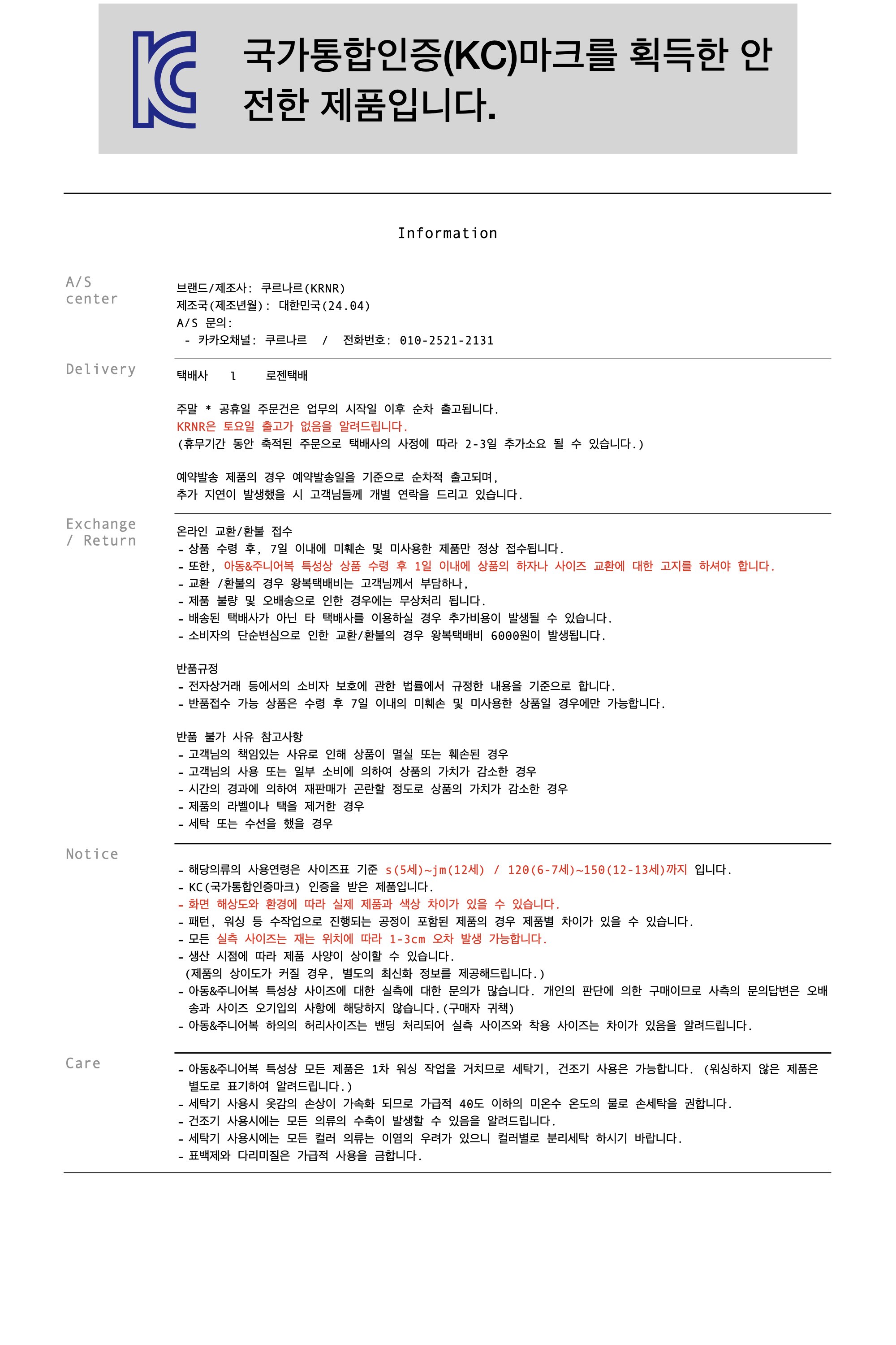 ∗ 교환/반품 접수 시 KARYMARKET에서 택배사 수거 접수를 해드립니다.